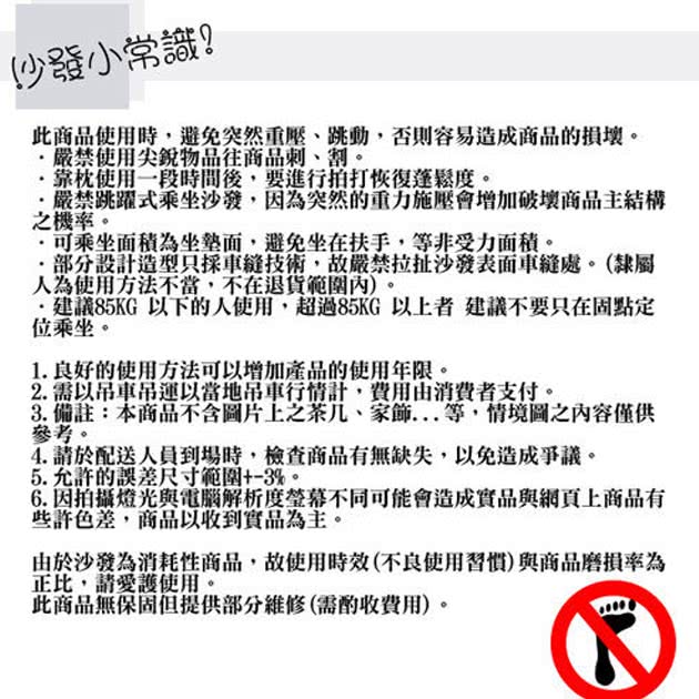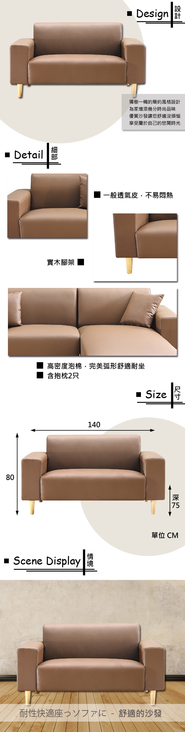 (如圖,網頁產品因電腦螢幕設定差異及拍攝關係請以實品顏色為準。 不含情境圖內之擺設飾品,尺寸標示皆有正負3?) 設計即是生活!獨樹一幟的簡約風格設計,為家中角落增添幾分時尚品味,或躺或坐,舒適感讓您盡情釋放一身的疲累,暫且忘卻腦中煩雜的思絮,享受只屬於自己的悠閒時光。優質設計的沙發構思都是針對台灣各種乘坐習性來做改善,買到了品質也要買到設計,100?灣精心製造,頂級高彈力釋壓海綿,徹底支撐人體壓力,彈性佳超耐用,坐墊採用高密度泡棉坐感極佳不易塌陷、久坐也不易變形,舒適好沙發還不入手嗎!?此商品不需DIY組立,此商品為組立後之成品。?高密度泡棉,舒適耐座。?實木造型椅腳,完整的穩固性,並且兼具了整體沙發的美感與質感。?品質保證、專業設計、貼心服務。?全由專人配送到家,專業安心服務,替你省下更多時間。